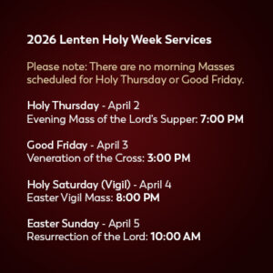The Rosary is said each weekday morning and Sundays at 8:30 am, Saturday evenings at 3:20 pm.